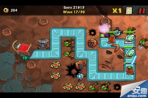 游戏开始,点击相应的空位就会出现防御塔选择画面,再点击相应的防御塔就可以放置,一样能够升级或者出售,跟平常的塔防游戏没有多大区别。特点在于本作地图中,道路周围很多稀奇古怪的障碍,必须一边防御怪物进攻,一边把这些障碍清除掉,才能获得放置防御塔的更佳位置。地图上所有东西(除了小床……废话)都可以打烂,只要点击一下这些奇特地形防御塔就会自动集火,再点击一下解除集火,利用这一点操作可以在每一波怪物出来之前把一些障碍打掉。有些关卡甚至没有空余的位置安置防御塔,必须迅速的清出位置才能保证守住据点,大大加强了可玩性。