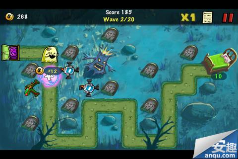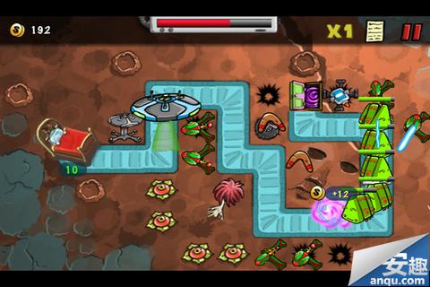 游戏的画面风格有点阴暗,可能这也稍微影响到了产品的下载量,不过这种涂鸦风格的画面也是一大批忠实用户的最爱。而音效上我个人感觉比《保卫萝卜》更舒服,虽然略有怪异,但是和游戏很搭配。玩法上我就不多作介绍了,和《保卫萝卜》完全一样,而推荐的理由有二:1.原作我们应该支持,2.这货限免,必须要收。