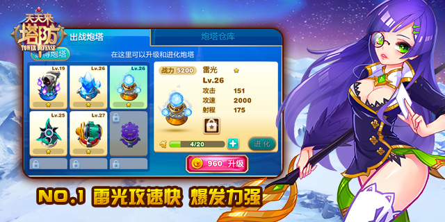 在《天天来塔防》的诸多炮塔之中,雷光的攻击力并不高,但胜在攻速非常快,2000的攻速是所有炮塔中最高的。雷光在未进化之前,是一个单体攻击炮塔,升级后的特殊效果能有几率额外攻击一个目标,这就让雷光的能力得到了进一步的加强,在实际战斗中作用更明显。
