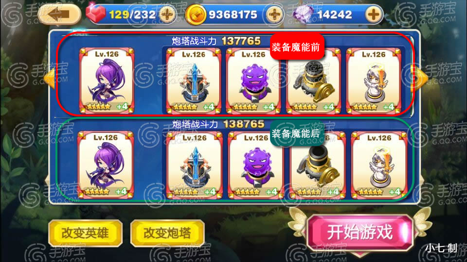 这是无尽的装备魔能前后数据对比图。。只对4个塔加成,对英雄无效。。