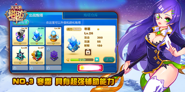 寒霜在整个炮塔体系中可以算做是辅助类的炮塔,和炎魔一样能对周边所有目标发动攻击,造成伤害。寒霜的攻击能力非常有限,但寒霜会给目标附加冰冻效果,降低怪物的移动速度,升级后的寒霜还有一定几率冻结目标,配合强伤害的炮塔能让玩家战斗更加游刃有余。