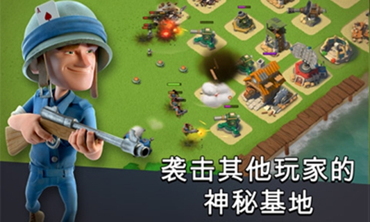 《海岛奇兵》从沙滩指定范围内登陆。然后在海面上有战舰提供导弹、医疗支援,同时还能释放引导弹进行实时打击目标指挥。至于坐着登陆艇成功冲上岸的士兵,全自动战斗,会优先攻击最近的建筑,这时就需要你引导他们集中火力,打掉敌方防御工事先。最后,只要摧毁敌人的司令部就能引爆敌人整个基地,获得胜利,拿到战利品。