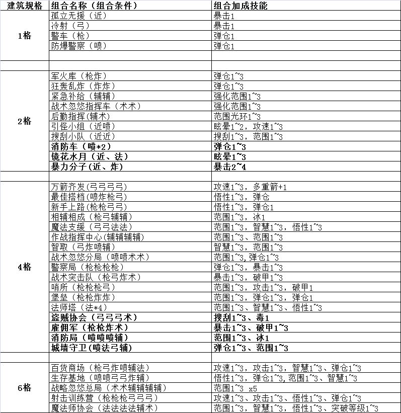 1 防御塔组合。特定建筑上建造特定防御塔,可获得额外技能加成。组合类型丰富。