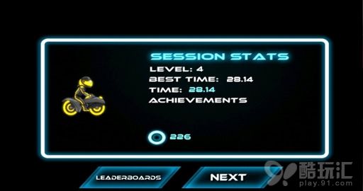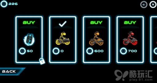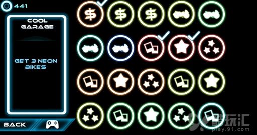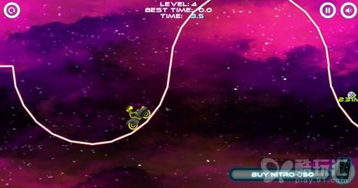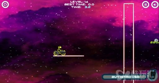 霓光式的背景仔细看风格简约并不是非常细致,但用色鲜明、对比强烈所有元素合在一起使画面显的相当舒适而有大宇宙空间的开阔感,商店中除了氮气存量以外,游戏也提供了各色外观的车种供玩家购买使用,也让玩家有着继续闯关的目标。