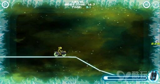 好在随着关卡进度的前进,游戏场景的安排也就更加要求技术,只是傻傻的往前冲并不见得就能使过关的时间压低,像是有时必须暂停而往后滑才能找到出路的岔路,或是需要向上飞跃才能通过的两段坡道,死死的加足油门只会原地停留或拉长滞空时间反而使成绩不美,必须善用前后轮着地,并妥善的掌握加速的时机才能跑出最佳成绩。