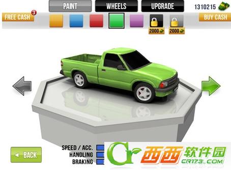 在赛车选择界面我们可以PAINT为赛车上色,WHEELS为赛车更换轮胎,小编提醒你,PAINT与WHEELS都不影响赛车性能。而UPGRADE中可以为赛车升级,有三种性能:SPEED速度、HANDLING操控、BRAKING刹车可以升级,赛车性能上的红杠杠代表该赛车能升级到的最高性能属性。
