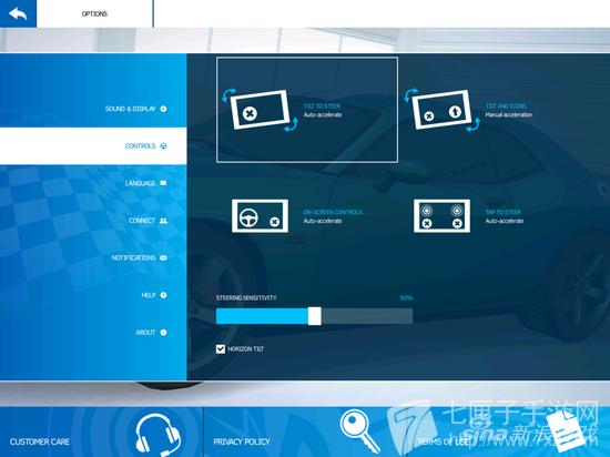 游戏为玩家提供了四种不同的操控方式,其中默认为重力感应+点击屏幕的形式,即依靠倾斜设备控制转向,通过点击屏幕实现刹车和释放氮气。玩家可以随时在设置菜单中进行操控方式的选择,以找到最适合自己的一种。