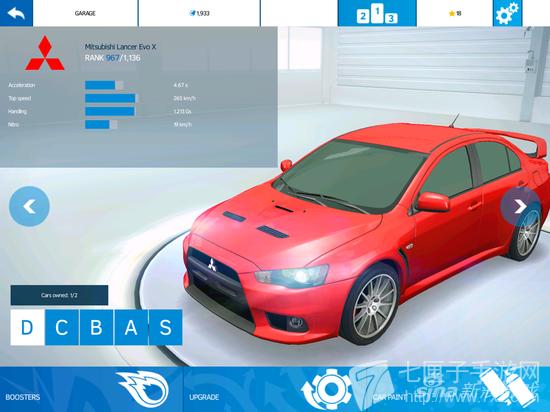 稍显遗憾的地方在于,游戏仅为玩家提供了10辆赛车,即DCBAS每个等级各两辆。好在有布加迪威航和迈凯轮P1等顶尖跑车助阵,否则恐怕很难满足玩家的要求。玩家可以在游戏内为赛车进行升级改造,以达到更高的性能,挑战更为激烈的赛事。