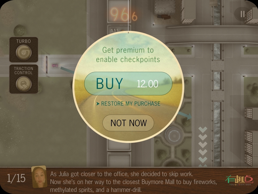 Does Not Commute 是一款无广告的免费游戏。你可选择通过一次性应用程序内购买 的方式得到高级升级版,以能够从这些关卡 处继续游戏。