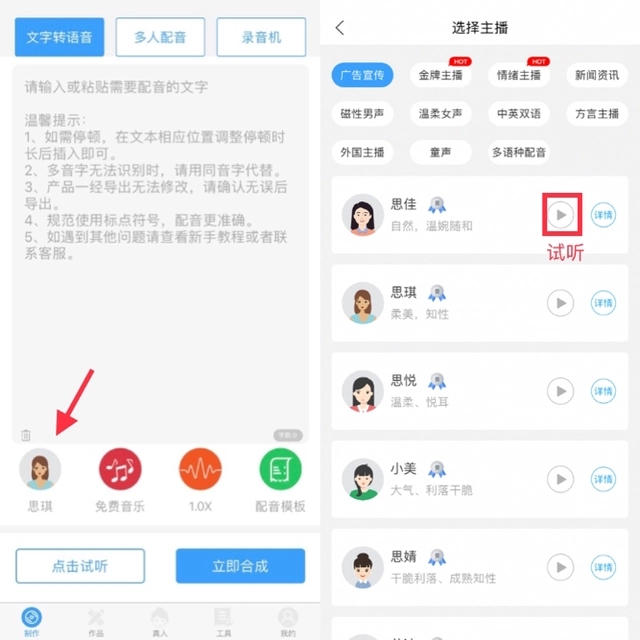 2.或直接选择配音模版文案,并试听样音,选择合适的主播