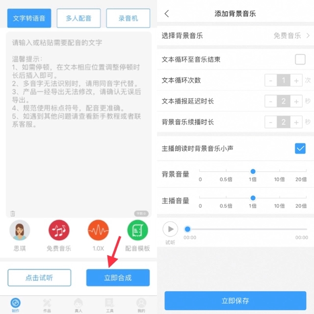 3.点击【立即合成】,调节音频循环次数、添加背景音乐等,做好备注,保存