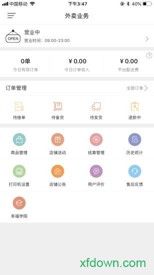 幸福商家版是入驻商家使用的管理软件。主要功能是接受并处理用户订单、处理退款、参加优惠活动、编辑商品、在线结算、编辑店铺信息及店铺打烊,并能够随时调整营业信息和商品库存。让你能够轻松及时的管理店铺!