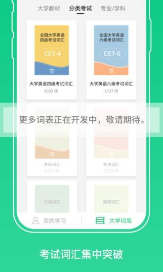 考试词汇模块目前收录全国大学英语四级考试词汇和六级考试词汇,内容包括完整词表、发音、释义(英汉双解)、典型例句(英汉对照)等,旨在帮助用户考前有针对性地学习或集中复习词汇,以期助力通过相关考试。