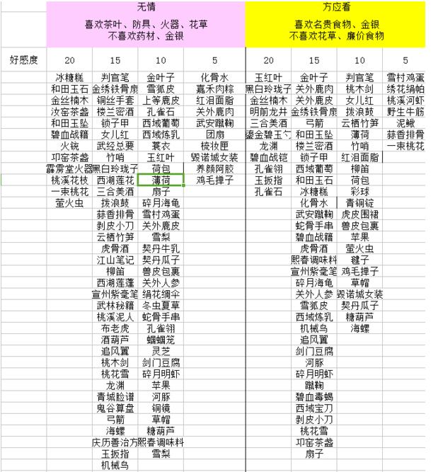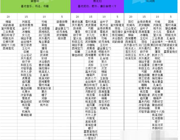 顾惜朝:是个文青,送他胡笳十八拍,笔,一些比较文艺的东西,但不能太贵重,金叶子给他,会受到他的训斥。他有一种文人的清高
