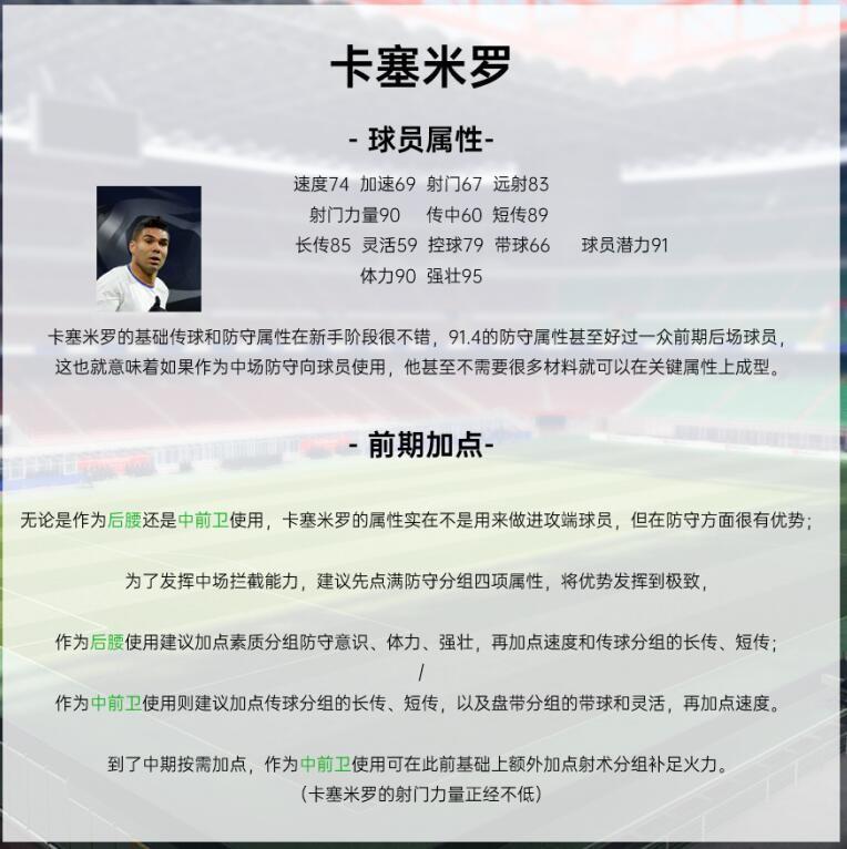 前中期后腰位置上非常实用的球员,自带绞肉机特点和95分抢断属性能当半个后卫用。