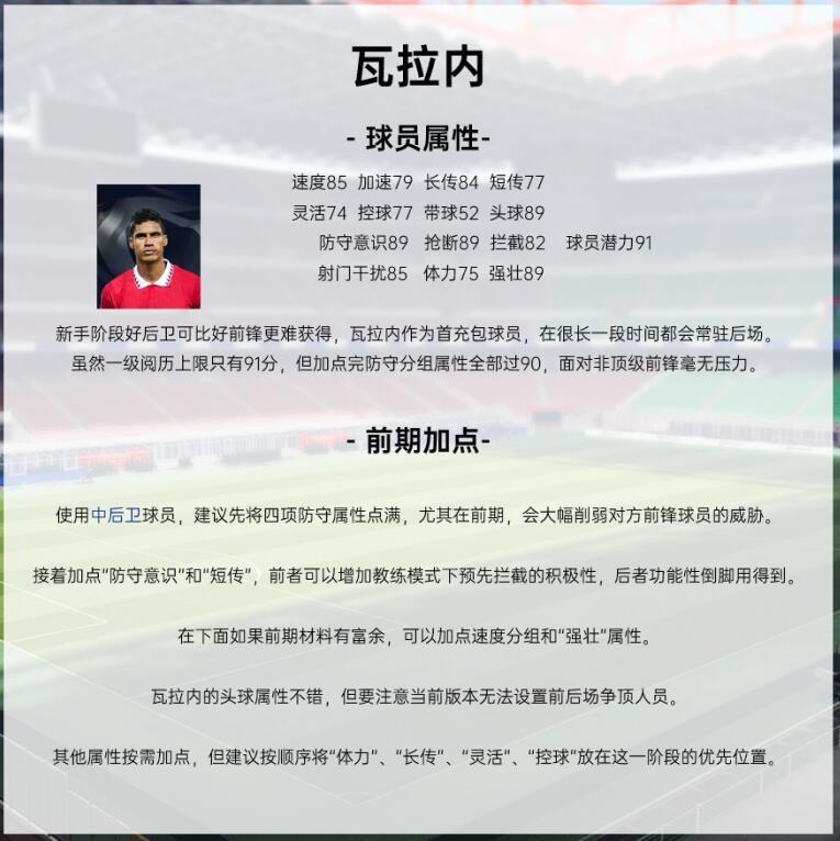 新手阶段好后卫相对来说更难获得,瓦拉内虽然属性不够出众,但对新人玩家来说很长一段时间都是后防线上的主力。