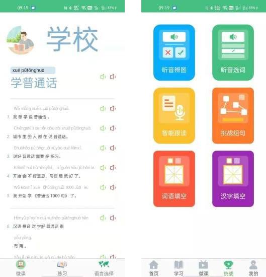 通过听音辨图、听音选词、智能跟读、挑战组句、词语填空五种题型反复理解、记忆内容,提升学习者普通话的听力、理解力与应用能力。