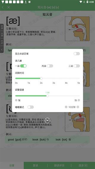 3.各种不同的跟读点读方式让大家可以随时设置,还能够设置连读模式,调整语速。
