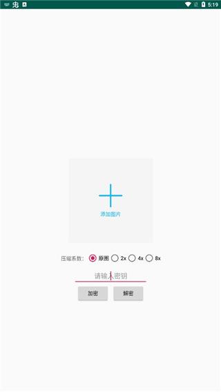 2、点击“+”号添加图片,选择压缩系数,并输入密钥(0-1之间的任意小数,不包括0和1)。