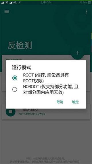 运行模式,这里有两种,一种是root模式,一种是免root模式,root模式更稳定