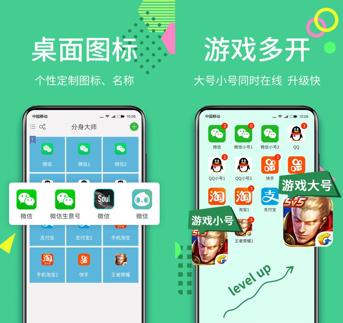 独立研发的应用多开分身功能,更稳定的微信多开分身宝、分身助手,满足商务、游戏玩家、微商等人群微信多开分身需求。完美支持微信多开分身、QQ多开分身、游戏多开分身等所有应用无限多开分身。