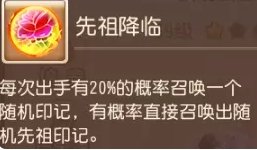 进阶后技能称为“先祖降临”,召唤印记时50%概率直接招先祖,非常强大的进阶,但也看脸,平均10回合能拉出一个先祖,运气好的话,短期便有1-2个先祖来支援,瞬间战场优劣势态发生重大改变