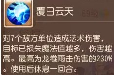 可攻击目标数超过1时,使用龙卷,可攻击目标为1时,使用龙腾,第三回合起,均施放覆日云天,此后非休息回合均施放覆日云天