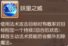 妖皇作为队伍中的唯一龙宫出战时,龙卷有着显著的法伤额外加成,大致可提升100点法伤结果,鉴于妖皇第三回合起,一律使用覆日云天出手的特点,此技能几乎只能生效两回合所以意义不是非常大