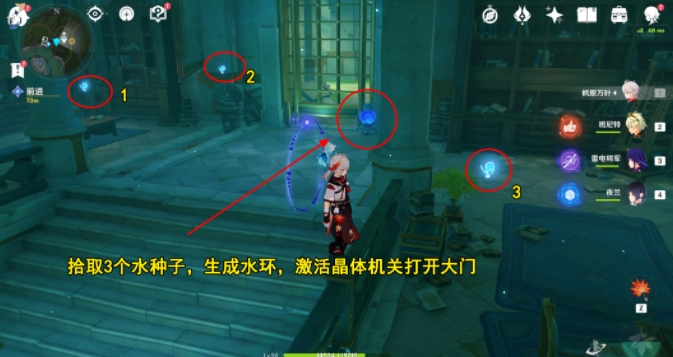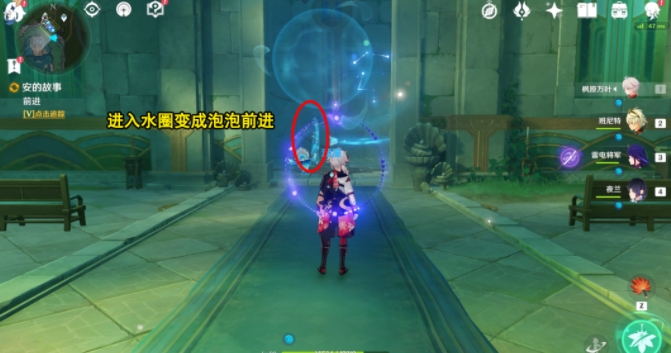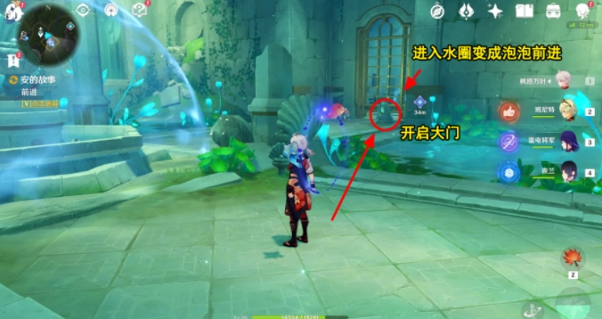 1.拾取3个水种子,生成水环,激活晶体机关打开大门,进入出现的水圈,变成泡泡前进
