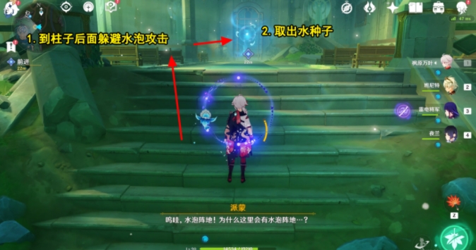 5.躲避水泡阵地的攻击,到左侧躲到柱子后面,利用攻击间隔取得水种子