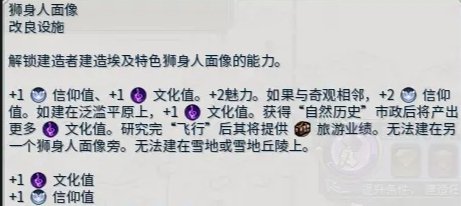 ②UI(狮身人面像):+1信仰值、+1文化值。+2魅力。如果与奇观相邻,+2信仰值。如建在泛滥平原上,+1文化值。不可相邻建造,不能在雪地地形修建。