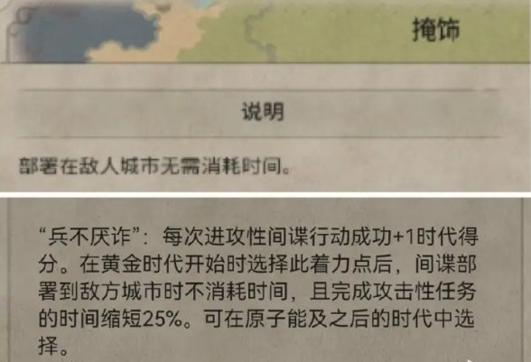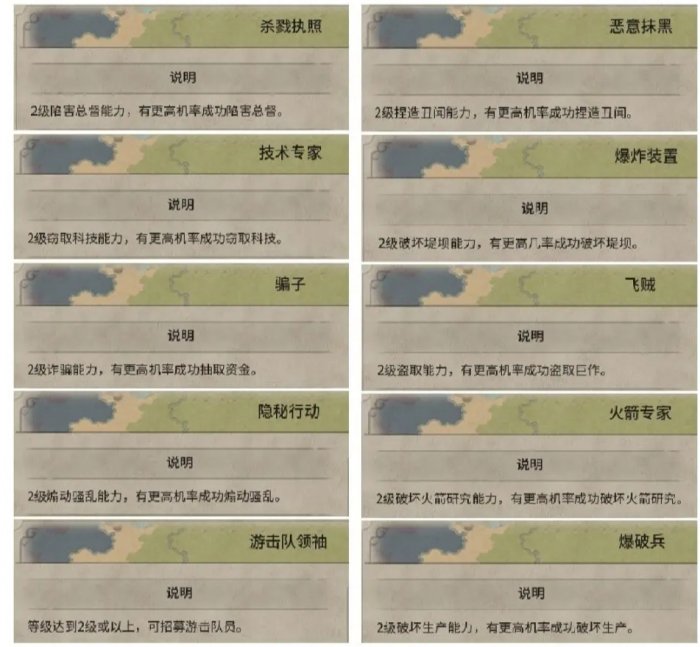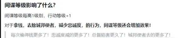 因为如图,间谍升级影响的不光有成功率,还可以增加任务的效果,并让你选想选的技能进一步增加行动力!
