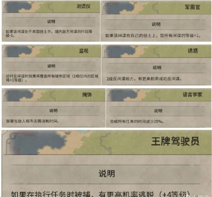 所有间谍享受高一级的任务成功率,与任务效果提升。