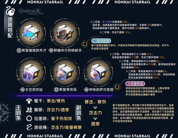 词条方面优先暴击,专光条件下有着充足的暴伤,因此需要更稳定的暴击发挥收益;速度方面前面光锥也提到了,132的阈值拉满专光,如果不想穿速度鞋那就通过自身提速或队友辅助尽可能达到触发线,与速度鞋差距并不算大,追求速度方面的攻击频率同样也是降低了部分攻击收益,这方面相互牵制按需求定夺;如果没专武,那更没必要追求速度,堆攻击就行;