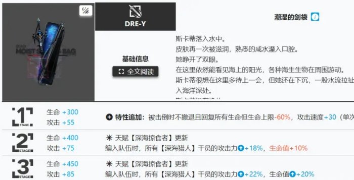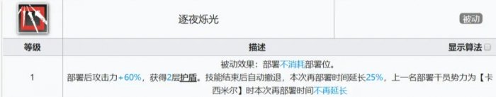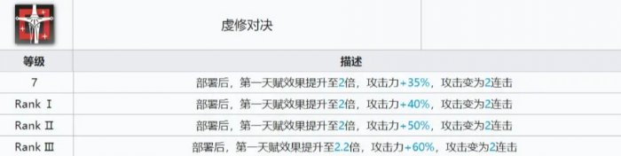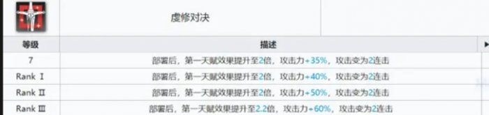 但是这招效果算是比较一般,在开启模组之后,第二天赋对攻击力的加成达到了24%,虽然不如斯卡蒂天赋“编入队伍时,所有【深海猎人】干员的攻击力+22%,生命值+20%”这样实用,但是整体提升率还是可以的。