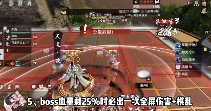 boss血量剩25%时必出一次全屏伤害+棋乱,此时玩家的行动方向与实际操控相反。