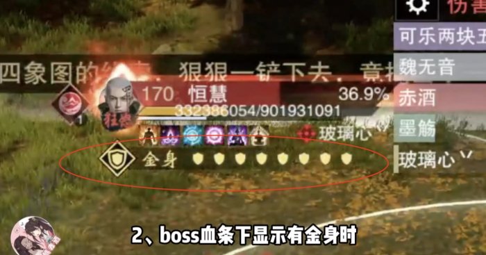 各个职业破金身的技能如图,建议在开打前调整一下技能加点,没有武当的队伍建议平时少放这些技能,等提示“破金身”时再用。