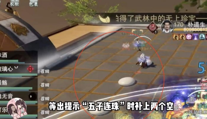 进入战斗之后可以先下点白棋,隔一个放一个,等出提示“五子连珠”时补上两个空,扛过这一波后继续下棋。