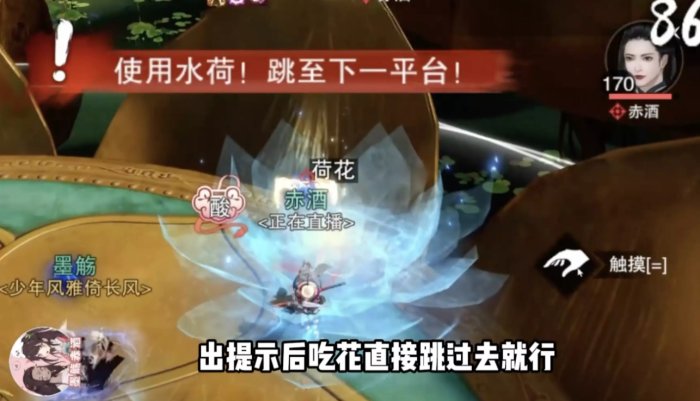 场上有五个莲花平台,boss剩余85、70、40、20血量时锁血换平台。出提示后吃花直接跳过去就行。