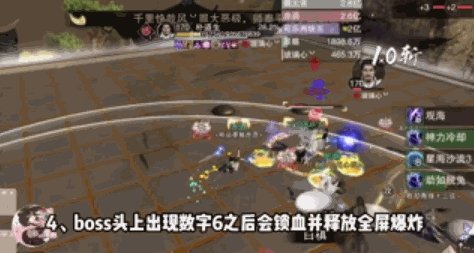 boss头上出现数字6之后会锁血并释放全屏爆炸,玩家注意提前散开,找到场上没有红色的区域,等爆炸结束后再打boss。