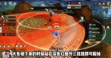 大鱼砸下来的时候站在深色红圈外三段跳即可躲掉。