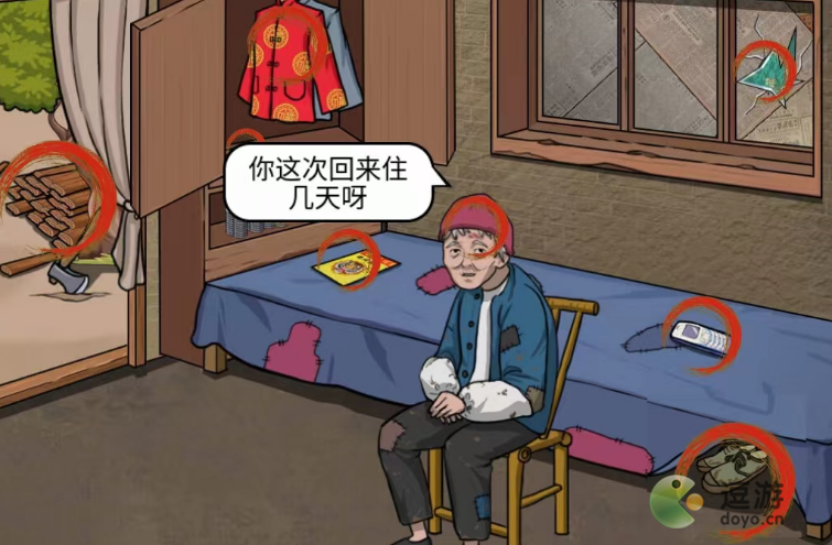 5、最后再点击衣柜,点击里面的衣服和信封,点击没电的手机、过期食品、废品、破洞、柴火伤痕即可通关