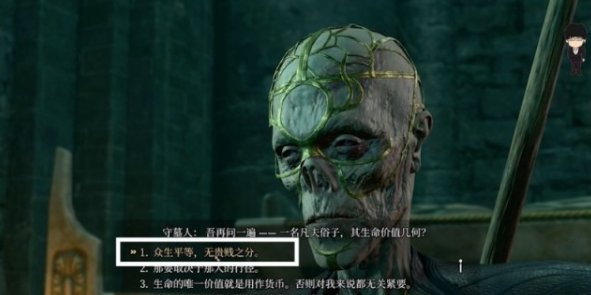 解决完后,通过打开的机关进入,左边石棺开启触发剧情。保证选项都对只要全部选1就行,这样这位守墓人也就成为了我们的伙伴,之后会在营地待命