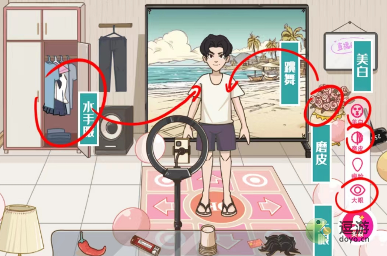 2、点击美颜,将美白、磨皮、大眼都打开;将花盆的花拖动给主播,开始跳舞