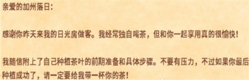成功访问日光室并完成隐藏环节后,大家会惊喜地发现茶叶出现在你的手中。接着,便可以每隔一定周期回到日光室去收集新鲜的菜叶,并等到一个指定的日子,此时,我们有望收到来自卡洛琳的亲笔信——即关于茶树种子配方及种植方法的秘籍。阅读并理解信件内容后,会顺利地为玩家解锁茶树的种植权限。