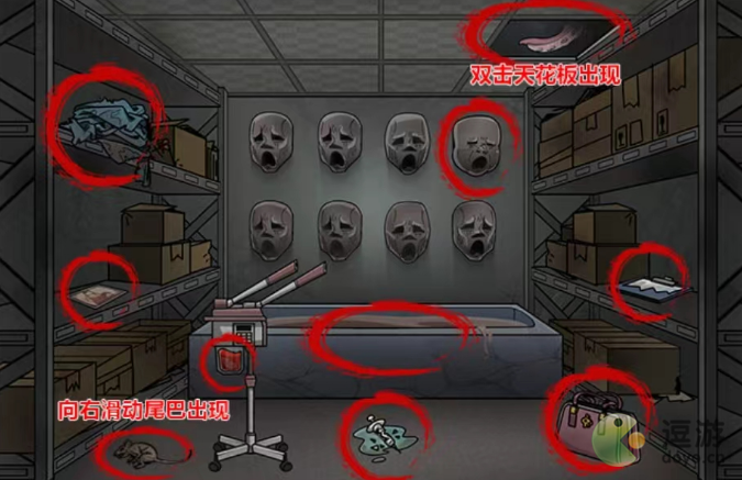 3、接着进入仓库,点击发臭的衣物、妈妈的合照、美容仪器、摔坏的针管、使用记录、妈妈的包包、奇怪触手、满池液体、变异老鼠、妈妈的面具