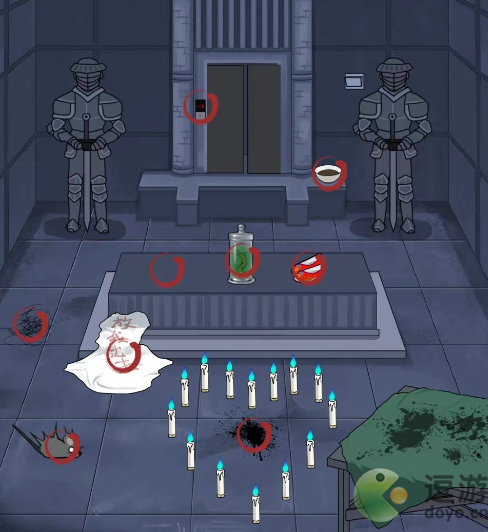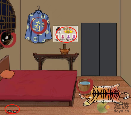 4、拖动左边盔甲手中的钥匙开木床上的锁,找到血书、木偶、罐子、红鞋子,即可通关