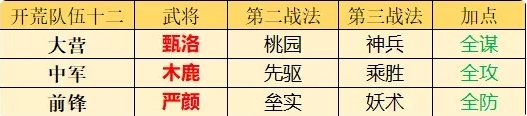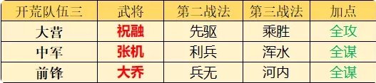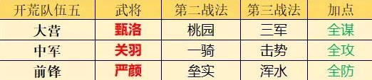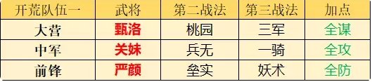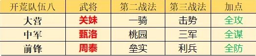 8、很元老的一支开荒队伍,火过一段时间,当时还没出宝物的时候,关妹作为主流开荒队伍,能搭配出来的开荒队伍很多,其中周泰前锋换张机也是同样的战法,但个人更推荐用周泰,因为真的很肉。
