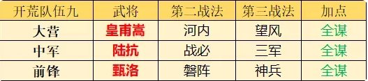 9、经过本人的实测,10级左右的皇甫嵩,单场输出平均6000左右,最高9000多,输出上限很高,但缺少减伤,为了省战法,我开荒用的是垒实桃园,个人建议玩家在开的时候用战必磐阵。