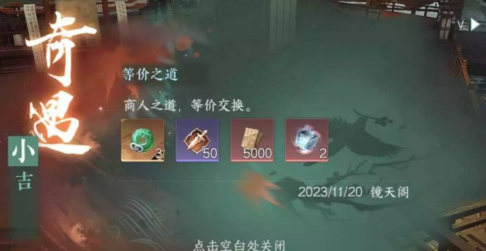以上就是《逆水寒手游》镜天阁小吉奇遇等价之道任务攻略的全部内容 ,更多逆水寒手游相关攻略点击逆水寒手游专区查看!